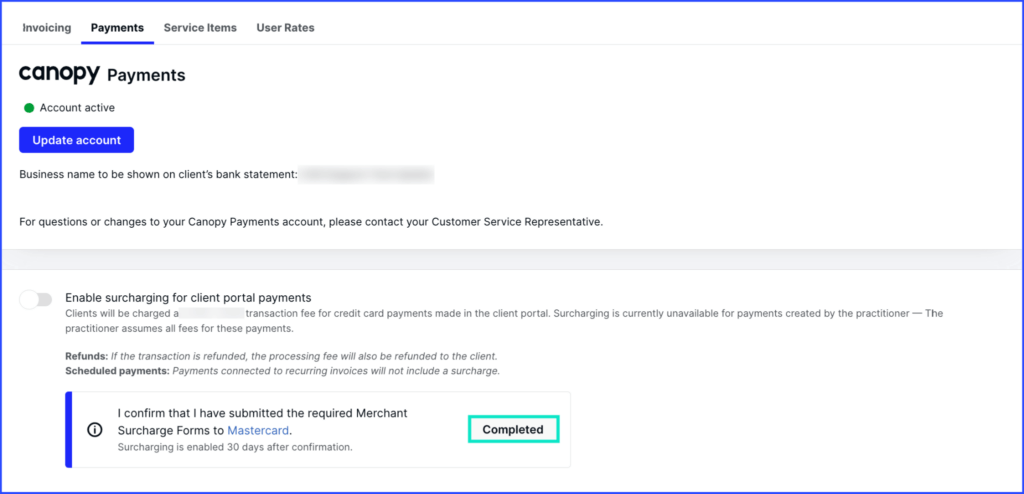 Canopy Payments enables firms to accept credit card and ACH payments directly through the client portal, with payments typically processed within two business days. Surcharging options allow firms to pass credit card fees to clients if desired.