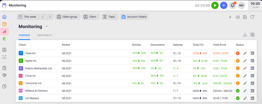 Uku’s client agreement monitoring automatically compares agreed-upon work volume with actual work performed, providing real-time visibility into profitability. The system tracks both sales prices and actual cost prices. If an employee costs €30/hour but bills at €45/hour, managers can immediately see profitability. This helps firms identify scope creep and make data-driven pricing decisions.