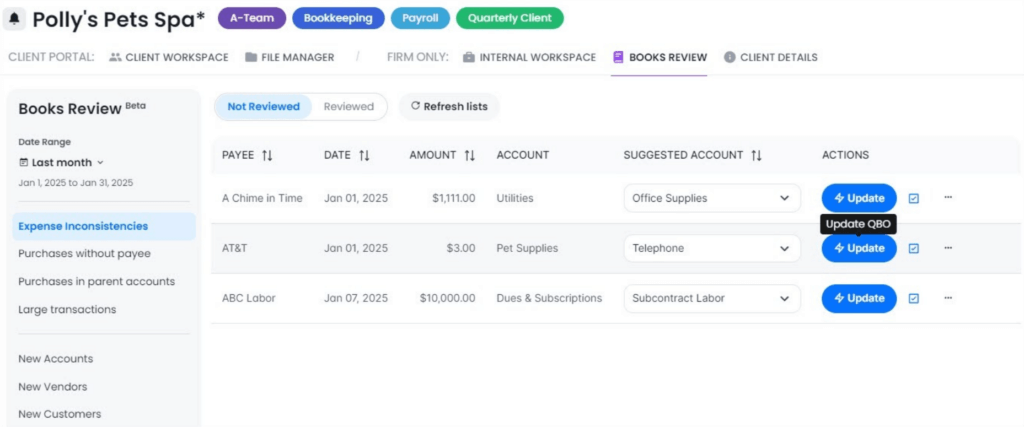 Client Hub provides reporting capabilities including views of jobs, tasks, and client work status. The AI-powered Books Review feature can identify anomalies in client financial data, such as miscategorized expenses or transactions missing payee information.