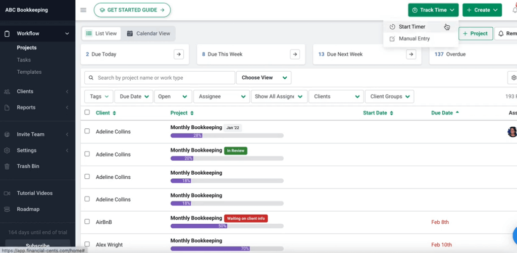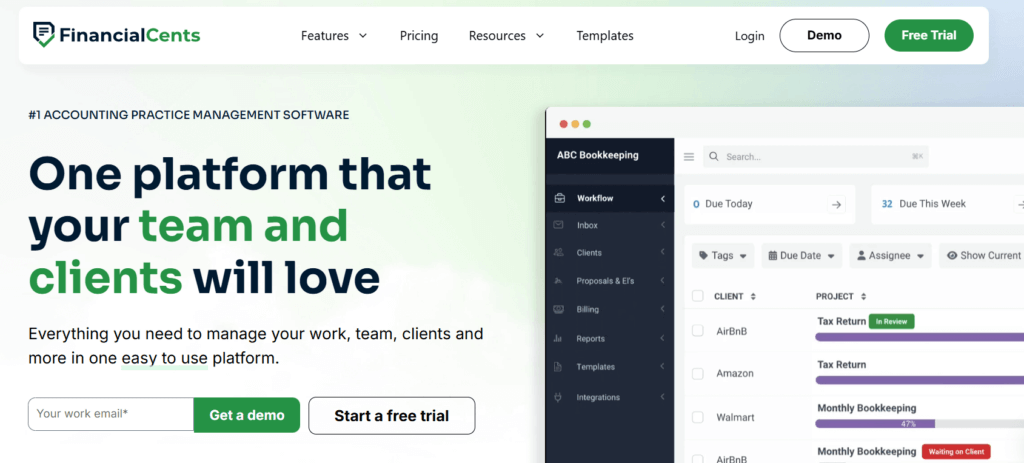 👉 Financial Cents excels as a comprehensive workflow management solution with an exceptionally user-friendly interface. Its passwordless client portal makes it effortless for clients to complete tasks, and the platform offers robust time tracking, invoicing, and profitability reporting. Financial Cents provides strong automation for recurring tasks and client reminders, plus a community-driven template library. The platform also offers the ReCats feature for managing uncategorized QuickBooks transactions. The trade-off? Financial Cents is US/Canada-centric with billing only in USD and no multilingual support, and firms with fewer than five users must commit to annual billing.