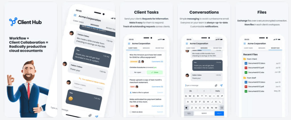Client Hub provides a mobile-first client portal with a dedicated app for iOS and Android. Clients can receive and respond to secure messages, view and complete tasks, and upload files. The portal can be branded with the firm’s logo and a dedicated login URL. A notable feature is the deep QuickBooks Online integration that allows clients to categorize uncategorized transactions directly within the portal, with the data syncing back to QuickBooks automatically.