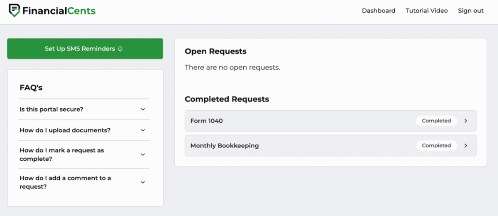 Financial Cents emphasizes removing friction for clients through its passwordless access system. Clients receive a “magic link” via email, eliminating the need to remember usernames and passwords. This simple innovation can significantly improve client response rates. The portal allows clients to view and complete tasks, upload documents, and communicate with the firm. Automated reminders via email and SMS keep clients on track without manual follow-up from the firm.
