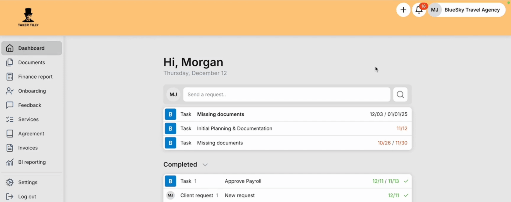 Uku offers an integrated client portal that goes beyond traditional portals by mirroring the exact same task on both the client and accountant sides. This means clients and accountants work on the same item with all communication, actions, documents, logs, and time tracking in one place. When clients make requests through the portal, notifications appear on the accountant’s dashboard, and they can immediately start tracking time or responding within that same task.