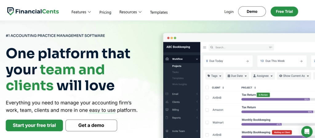 Financial Cents has established itself as a comprehensive all-in-one practice management solution for accounting and bookkeeping firms. With over 10,000 accountants using its platform globally, it offers a comprehensive suite of tools including workflow management, CRM, time tracking, client portal, and automated billing, all in one intuitive, user-friendly interface.
