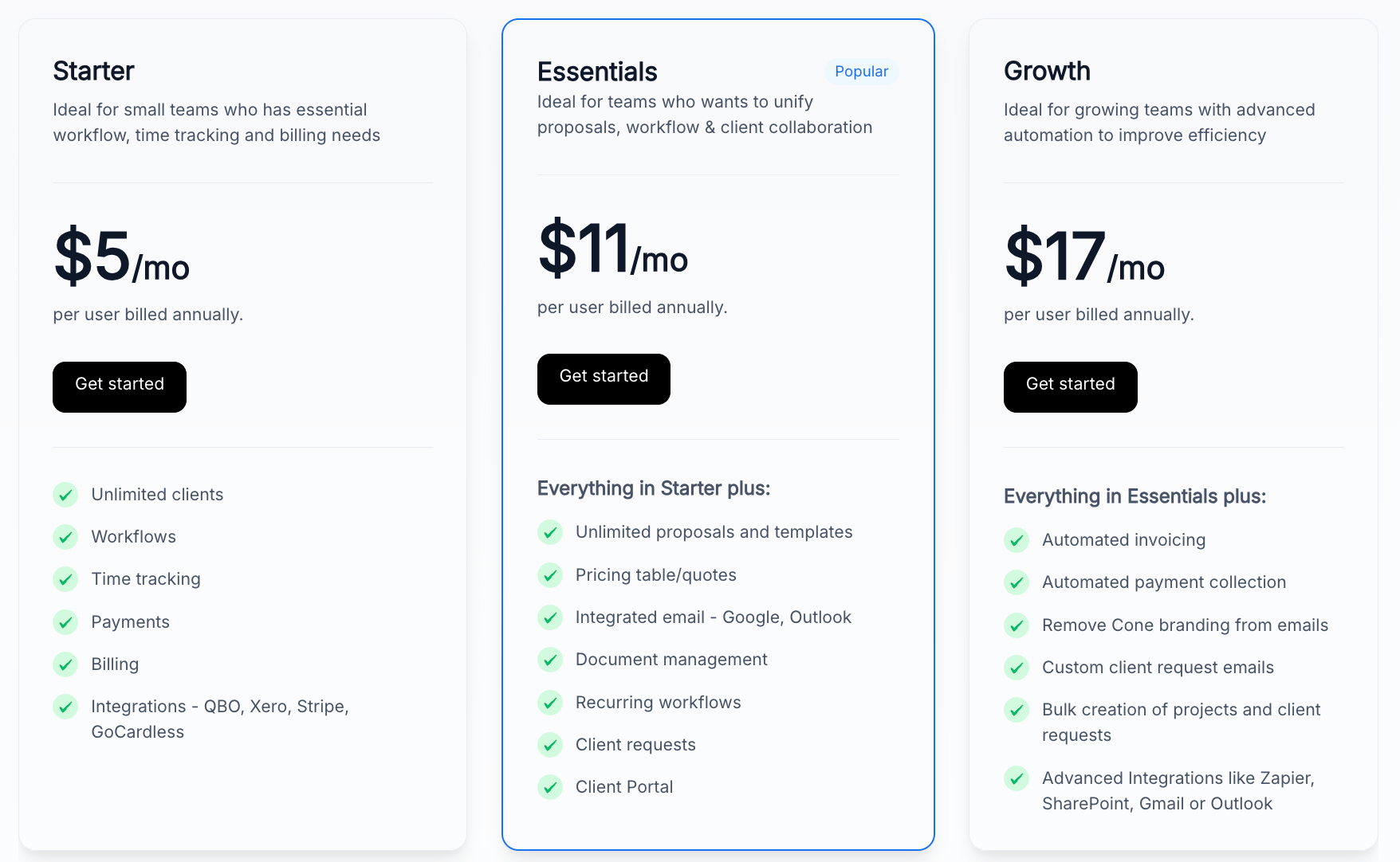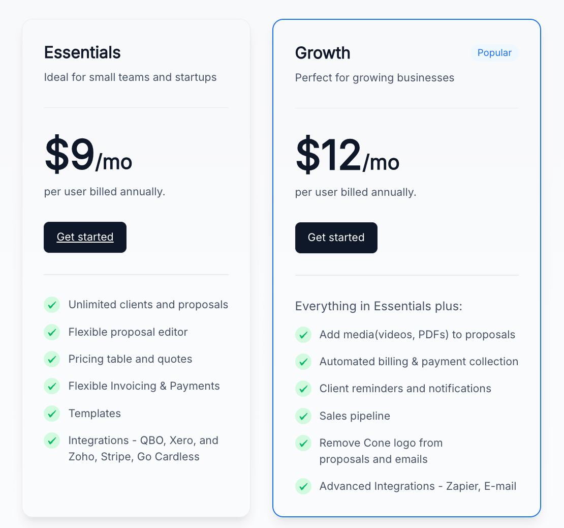 - Essentials: $9/user/month annually – Unlimited clients/proposals, templates, basic integrations
