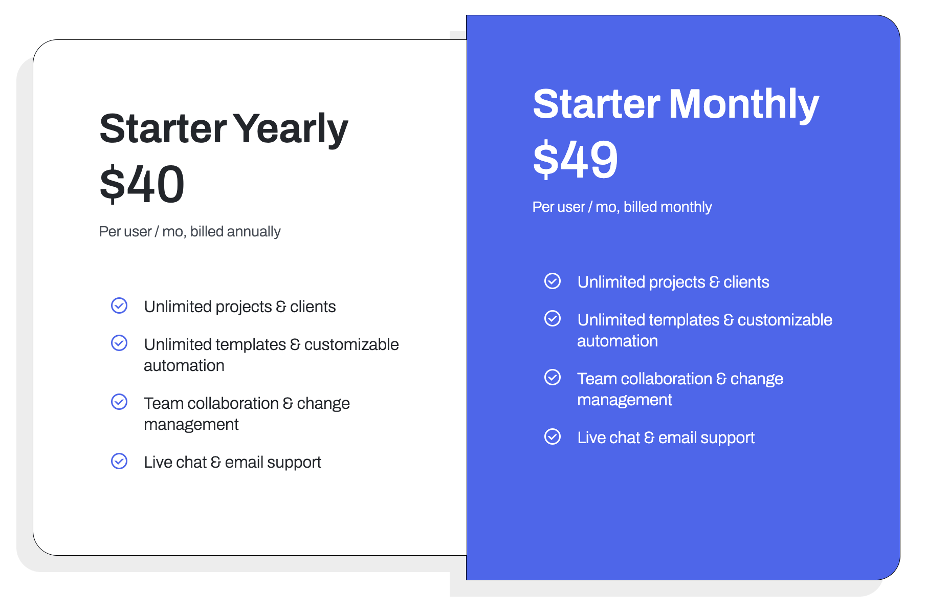 - Elite Plan ($48/user/month): Everything in Team plus Google Drive/OneDrive integrations, customizable portal menu, workforce management, actionable audit log, client budgeting, document management, e-signatures, and BI Reporting with business analytics reports
