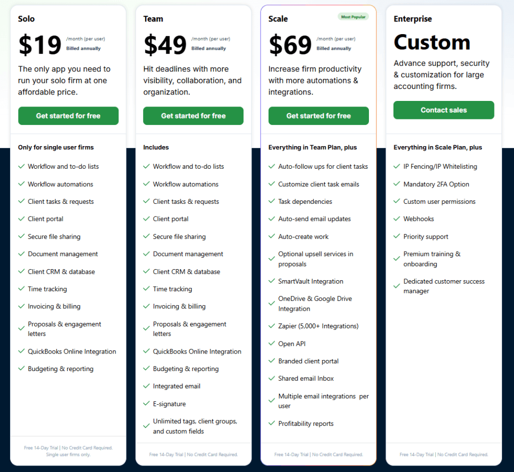 The Solo plan serves as Financial Cents’ entry point for individual practitioners. At $19 per month with a minimum 1-year commitment, it includes essential practice management features: workflow management, client tasks and portal, document management, client CRM, time tracking, invoicing, proposals, and QuickBooks Online integration. It also includes basic workflow automations.