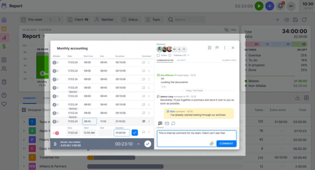 Uku’s Approach: Uku’s time tracking offers multiple methods including stopwatch, manual entry, and bulk time allocation across multiple tasks. With 90% of actions being one-click, the system maximizes speed for day-to-day admin tasks. Combined with BI Reporting showing real-time profitability per client, firms report ~20% reduction in task management time and ability to serve ~38% more clients.