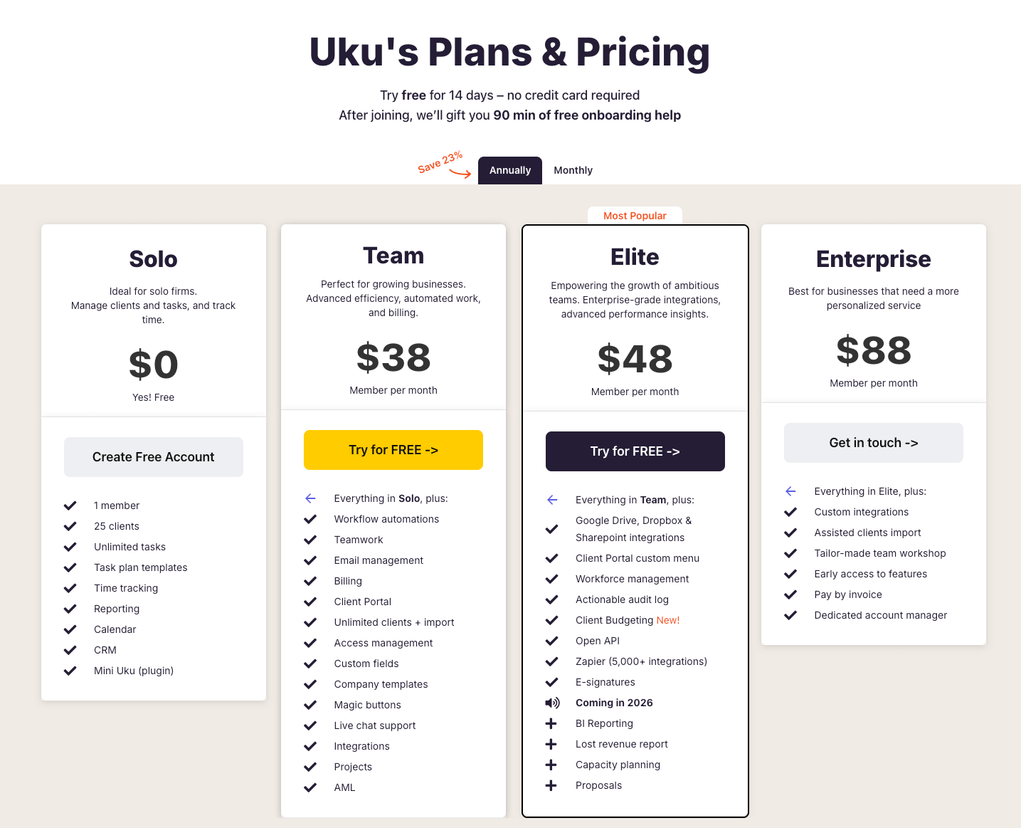 Uku’s Enterprise plan starts from $88 per month and includes all Elite features plus custom integrations for 50+ user firms, country-specific features like local e-invoice formats, assisted client import, tailor-made team workshop, early access to new features, invoice payment options, and a dedicated account manager.