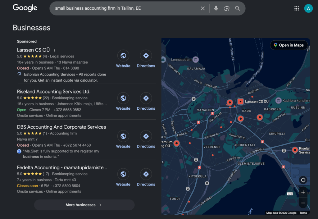 - GBM for local SEO: First things first, claim and complete your Google Business Profile so you appear in local searches and on Maps. It’s free and helps clients contact you quickly. Why is it important for your online visibility for local searches? See what comes up in the Google search engine when you look for “small business accounting firm in Tallinn, EE: