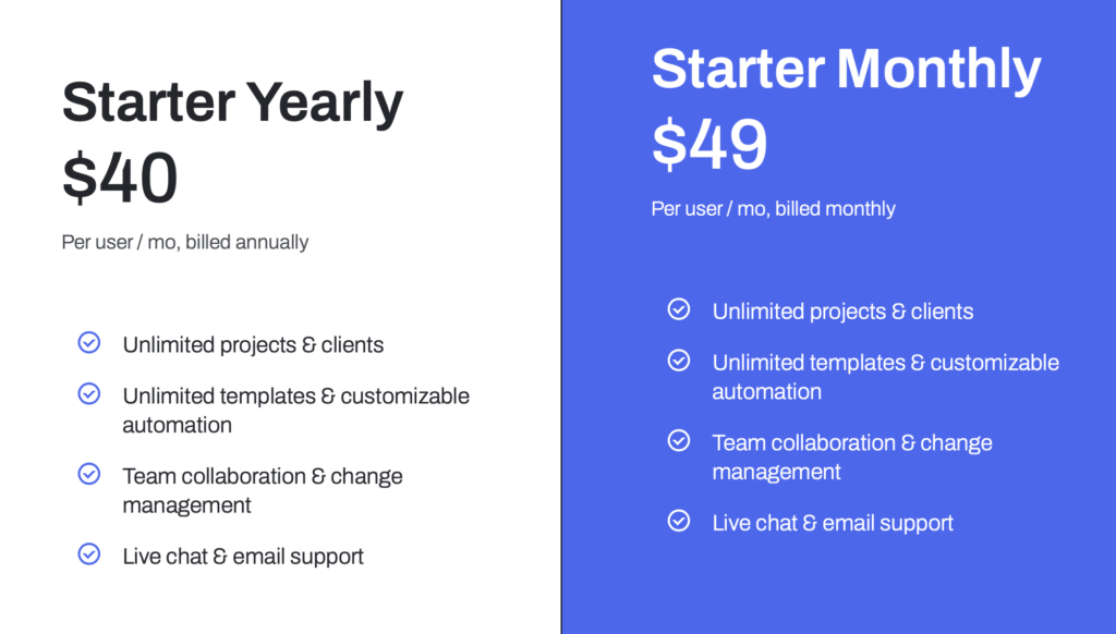 The Starter plan includes unlimited projects and clients, unlimited templates with customizable automation, team collaboration and change management features, plus live chat and email support. There are no feature restrictions based on which billing option you choose.