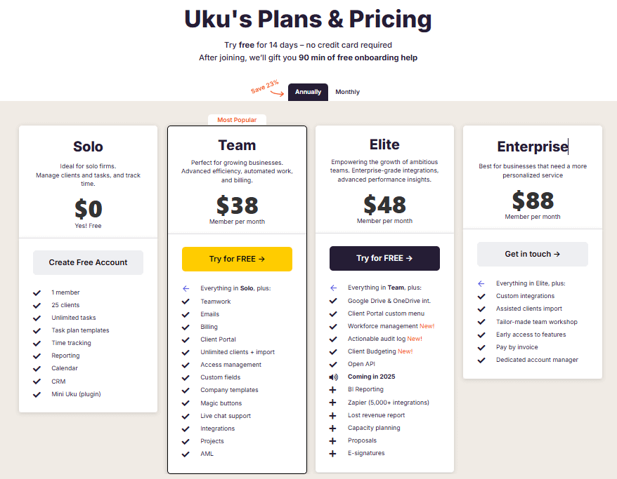 Uku’s Approach: Four tiers provide options for different firm sizes and needs, with pricing available in multiple currencies (€, $, £). The free Solo tier gives freelancers a starting point, while Enterprise provides dedicated support for larger organizations.