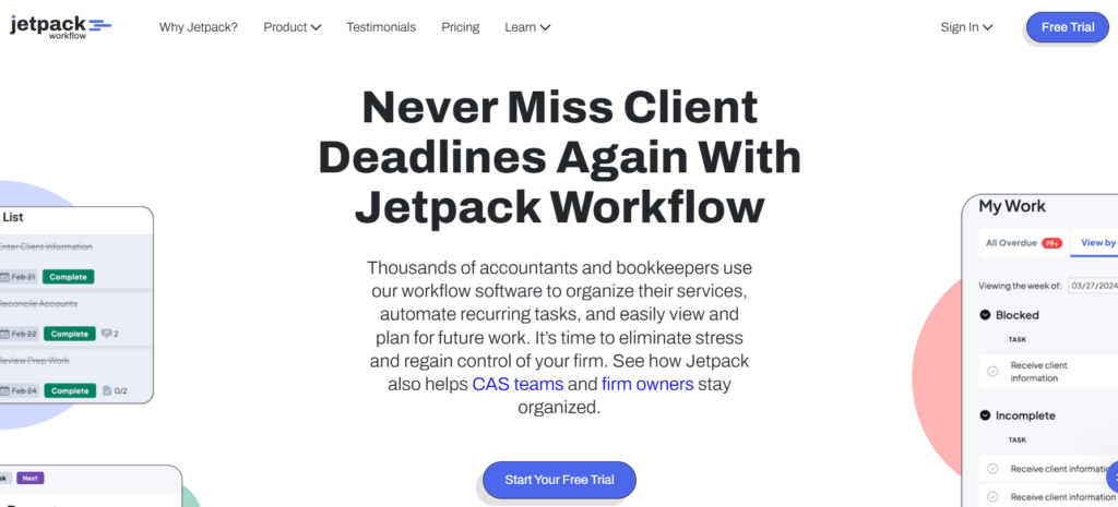 Jetpack Workflow has built a solid reputation as a workflow management tool designed specifically for accountants and bookkeepers. Since 2014, it has helped thousands of firms organize their recurring client work, track deadlines, and standardize their processes. Its focus on simplicity and ease of use has made it a popular choice for firms looking to move beyond spreadsheets without drowning in complexity.
