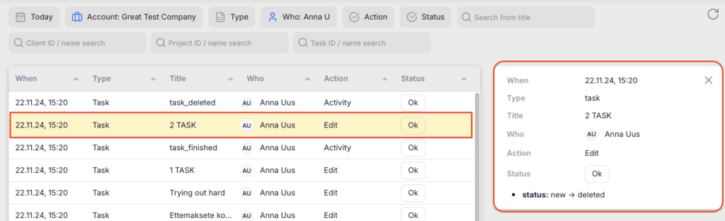 Team performance reporting displays time usage by employee, task completion rates, and billable versus non-billable hour breakdowns. The actionable audit log tracks all system changes and, notably, allows restoration of deleted tasks with their associated data and time entries.
