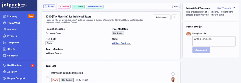 Today, Jetpack Workflow serves over 7,000 customers across 18+ countries. The platform positions itself as a dedicated workflow management solution rather than an all-in-one practice management suite. Core features include task and project management, workflow automation through templates, time tracking, team collaboration tools, and reporting.