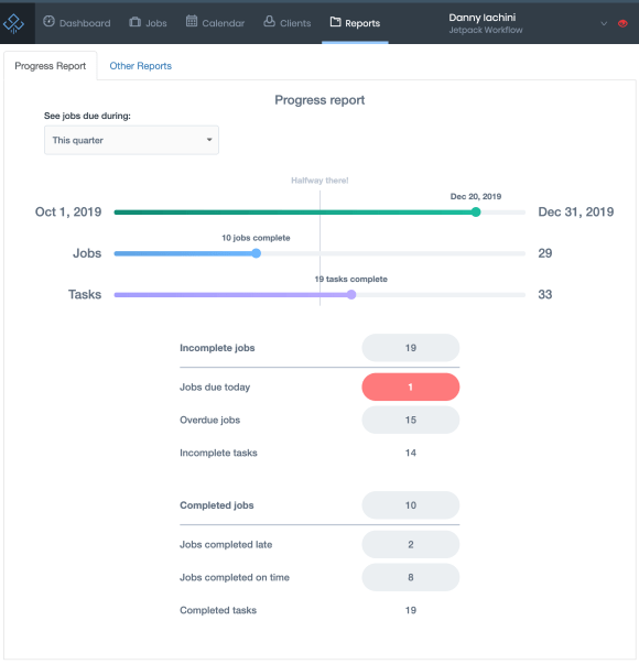 Jobs automatically move through two primary statuses: “Pending” (no tasks completed yet) and “In Progress” (at least one task marked done). Beyond these automatic statuses, Jetpack Workflow offers customizable labels for flagging work. Default labels include “Urgent” and “Waiting on Client,” and firms can create up to 50 custom labels.