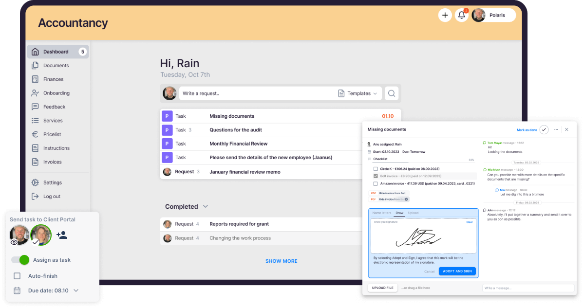 Suhtle mitme kliendiga korraga. Kliendiportaalis saad mugavalt dokumentide kohta täpsustusi paluda või kliendi küsimustele vastata. Määra oma kliendile ülesanne koos alamülesannetega, küsi dokumente ja hoia kolleege ja kliente tööga kursis.